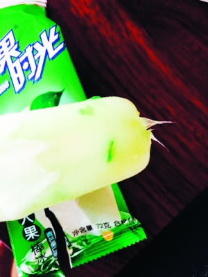 許先生說:“那天下午兩點(diǎn)多,我去超市買了6個(gè)宏寶萊的鮮果時(shí)光雪糕,回家后我和父母每人吃了一個(gè),而我的那個(gè)雪糕沒吃幾口就咬到一個(gè)硬物。我以為是椰果,便用力咬了一下,卻發(fā)現(xiàn)根本咬不動,低頭一看,發(fā)現(xiàn)雪糕里露出一塊塑料布。因?yàn)槲矣昧σВ@塊塑料布已被拽出一部分,還有一部分凍在里面?!庇浾呖吹皆S先生拿出的雪糕上半部分露出了兩塊塑料布。