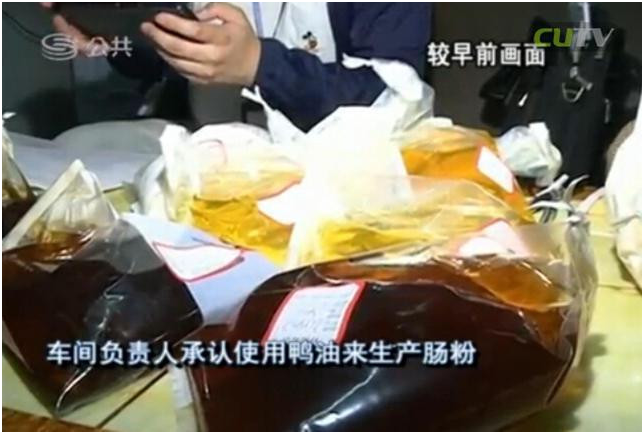 在執(zhí)法人員查獲6桶來歷不明的油之后,車間負責(zé)人承認(rèn)使用鴨油來生產(chǎn)腸粉?!斑@是什么油?”“是鴨油。”“烤鴨剩下的那種?”“對?!?