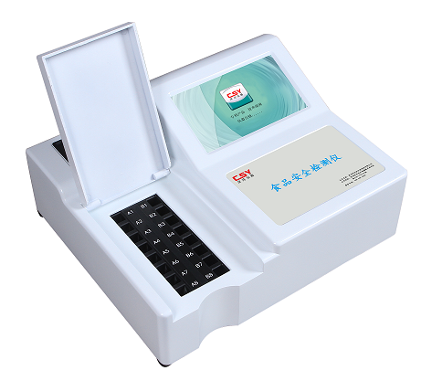 CSY-DS803肉類安全檢測儀由光源、比色池、高靈敏度集成光電池、微處理器、全漢字大屏幕液晶屏、嵌入式微型熱敏打印機、無線傳輸模塊和集成芯片構成,可直接在大屏幕液晶屏上顯示出被測樣品中相關指標的含量,并打印出分析結果,還可以通過計算機接口將數(shù)據(jù)傳輸?shù)健笆称钒踩畔⑾到y(tǒng)”終端數(shù)據(jù)庫進行分析。該方法單次檢測成本較低、操作簡便快速, 方便檢測人員或生產質控人員現(xiàn)場使用和車載使用。