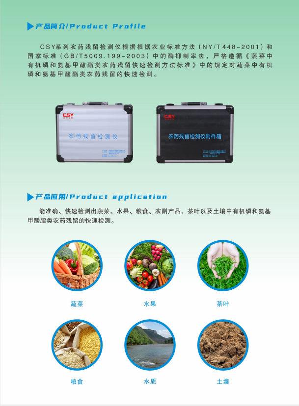 深芬儀器CSY系列農(nóng)藥殘留快速測定儀可以對瓜果蔬菜的農(nóng)藥殘留進(jìn)行準(zhǔn)確的檢測和篩查,杜絕超標(biāo)的農(nóng)產(chǎn)品流入市場。農(nóng)藥殘留快速測定儀可廣泛應(yīng)用于各級(jí)蔬菜檢測中心、農(nóng)貿(mào)市場、超市、環(huán)保機(jī)構(gòu)、蔬菜種植基地、飯店、車載及實(shí)驗(yàn)室等食品安全檢測與監(jiān)控場所等單位對果蔬中農(nóng)藥殘留的檢測。