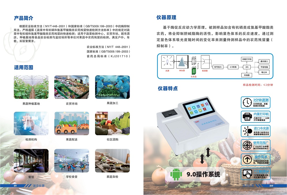 深芬儀器生產(chǎn)的安卓智能型農(nóng)藥殘留測定儀;是根據(jù)農(nóng)業(yè)標準方法(NY/T 448-2001)和國家標準(GB/T5009.199-2003)中的酶抑制率法,嚴格遵循《GB/T5009.199-2003蔬菜中有機磷和氨基甲酸酯類農(nóng)藥殘留快速檢測方法標準》中的規(guī)定對蔬菜中有機磷和氨基甲酸酯類農(nóng)藥殘留的快速檢測??蓮V泛應用于各級蔬菜檢測中心、農(nóng)貿(mào)市場、超市、環(huán)保機構(gòu)、蔬菜種植基地、飯店、車載及實驗室等食品安全檢測與監(jiān)控場所等單位對果蔬中農(nóng)藥殘留的檢測。農(nóng)藥殘留測定儀能準確、快速檢測出蔬菜、水果、糧食、茶葉以及土壤中有機磷和氨基甲酸脂類農(nóng)藥殘留的快速檢測。